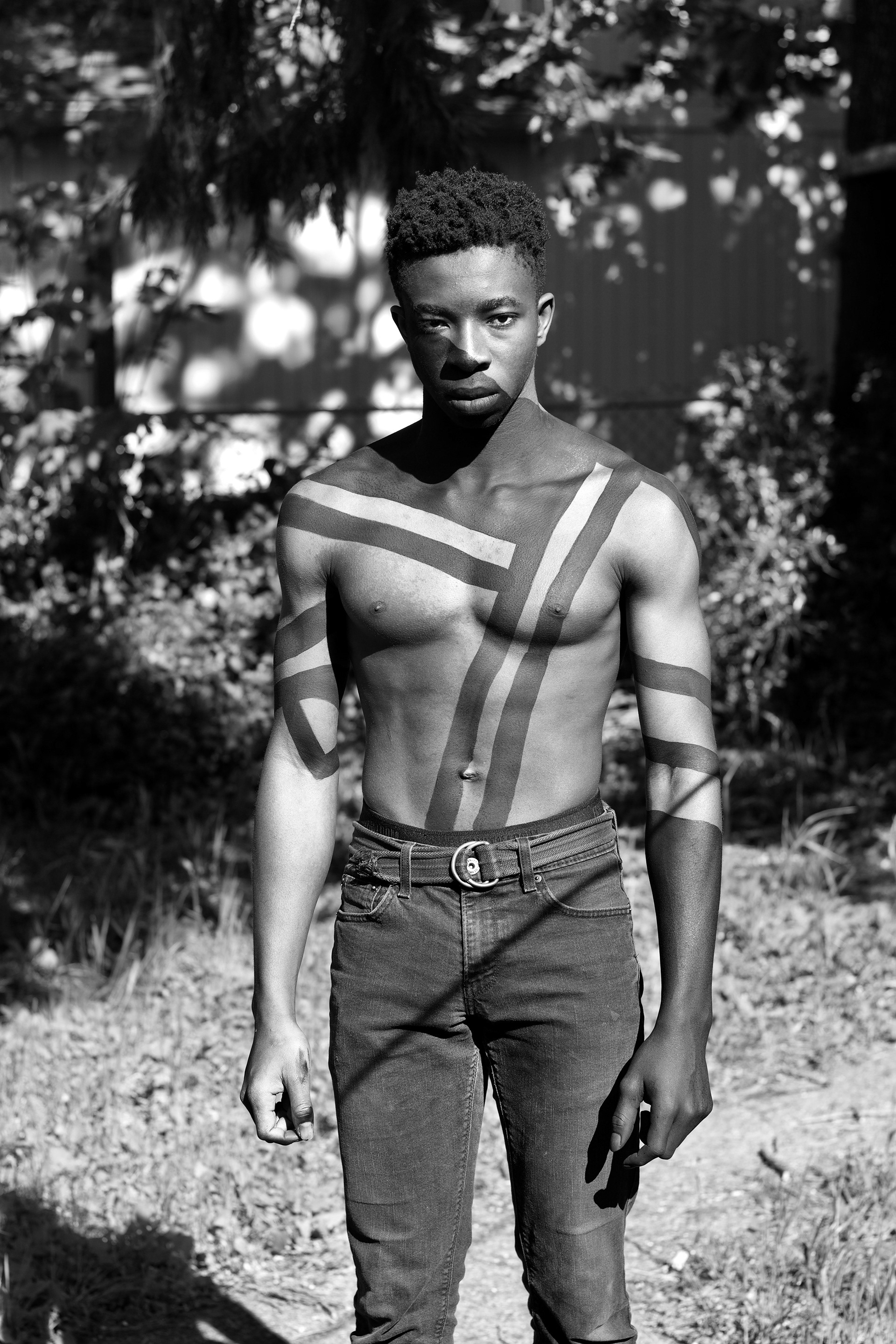 I originally began taking photos as a way to document my elaborate animal body paint art and from there found myself diving head first into photography. My most recent work, 'Lines', explores negative space through varying kinds of lines painted on or surrounding the body. I’m also particularly interested in how negative space exists within stripes, light and dark, the body, and confined spaces as an exploration on gender and trans bodies.
