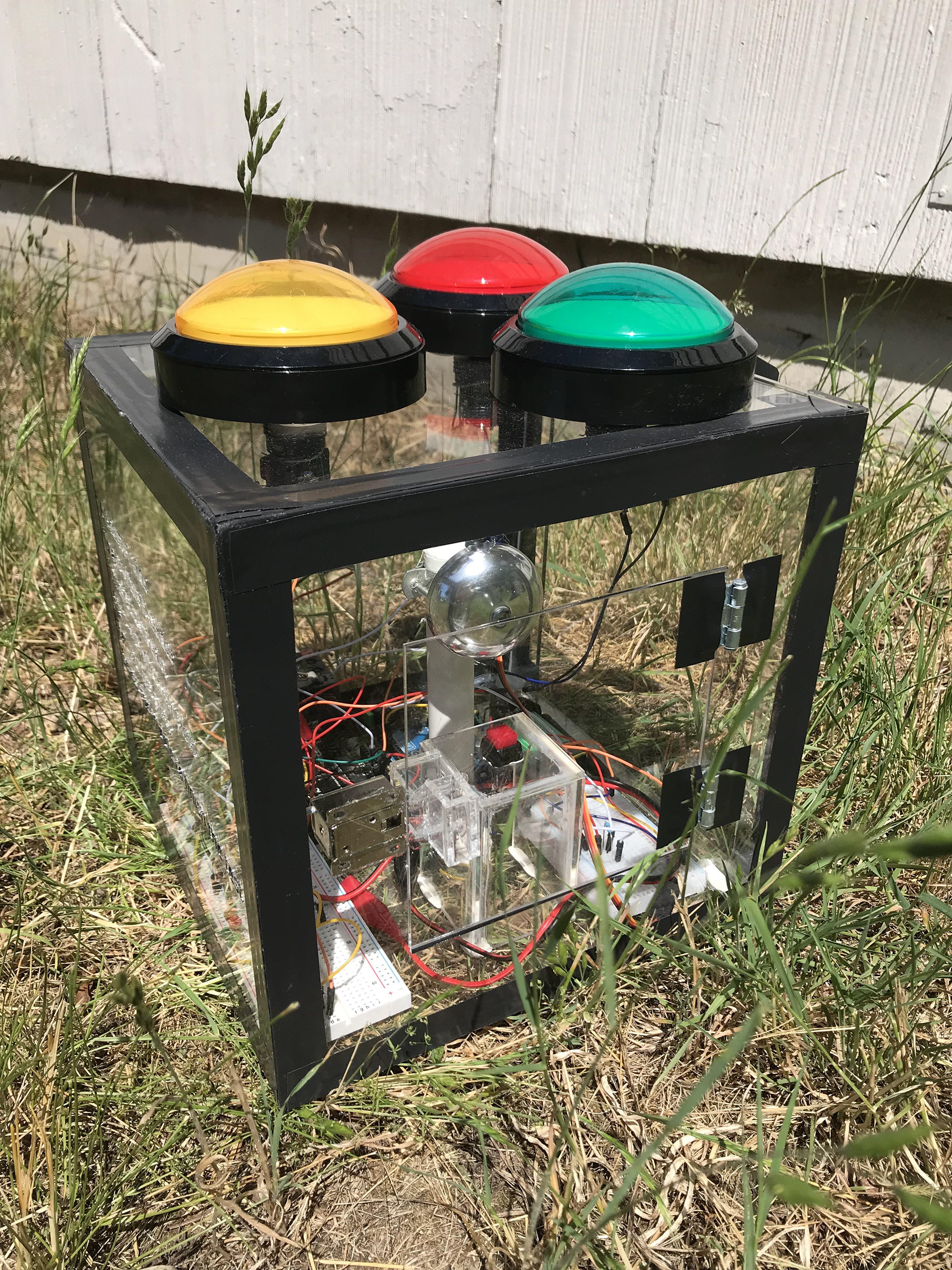 Puzzle Box is an installation piece placed in public buildings. When the correct combination of buttons is pushed the latch on the side unlocks allowing for a person to press a small red button which rings a bicycle bell. While the box is unlocked the person also has the opportunity to dismantle or break the device.